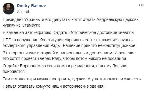 "Президент Украины и его депутаты хотят отдать Андреевскую церковь чуваку из Стамбула. Взамен на автокефалию. Отдать. Историческое достояние киевлян.