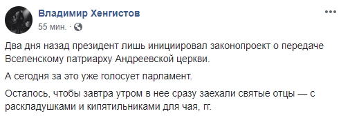 Журналист Владимир Хенгистов поразился скорости принятия решений по церковному вопросу: "Два дня назад президент лишь инициировал законопроект о передаче Вселенскому патриарху Андреевской церкви. А сегодня за это уже голосует парламент.