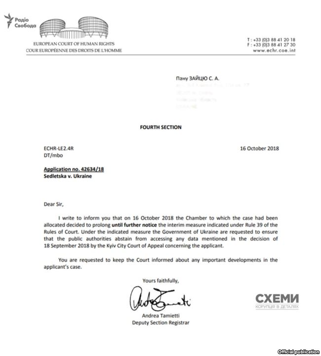 Европейский суд по правам человека в соответствии с Правилаом 39 своего Регламента продлил действие неотложных временных обеспечительных мер по делу журналистки Радио Свобода, главного редактора программы "Схемы: коррупция в деталях" Натальи Седлецкой. Также суд присудил правительству Украины "обеспечить воздержание органов власти от доступа к любым данным, приведенным в решении Апелляционного суда Киева от 18 сентября 2018".  Об этом говорится в официальном письме из ЕСПЧ, поступившего из Страсбурга в адрес редакции Радио Свобода 17 октября.