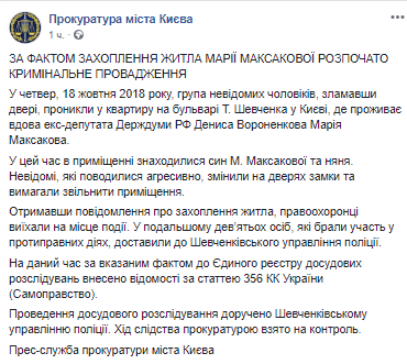 Полиция задержала девятерых мужчин, которые накануне, 18 октября, взломали дверь и проникли в расположенную в Киеве на бульваре Шевченко квартиру вдовы экс-депутата Госдумы России Дениса Вороненкова Марии Максаковой. Об этом сообщает пресс-служба прокуратуры Киева в соцсети.