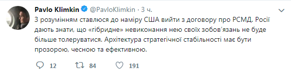В отличие от представителей Евросоюза, которые выразили надежду, что США и РФ продолжат переговоры и смогут сохранить в силе Договор о ракетах средней и меньшей дальности (ДРСМД), министр иностранных дел Украины Павел Климкин отнесся к намерению США выйти из ДРСМД с пониманием. Об этом глава МИД написал в своем Twitter.