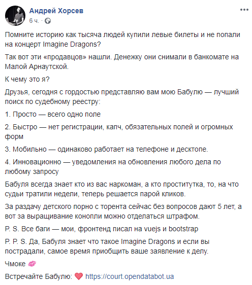 "Бабуля всегда знает, кто из вас наркоман, а кто проститутка; то, на что судьи тратили недели, теперь решается парой кликов", - написал Андрей Хорсев.