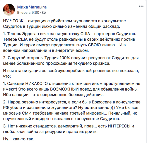 "НУ ЧТО Ж... ситуация с убийством журналиста в консульстве Саудитов в Турции имхо сильно изменила общий расклад.