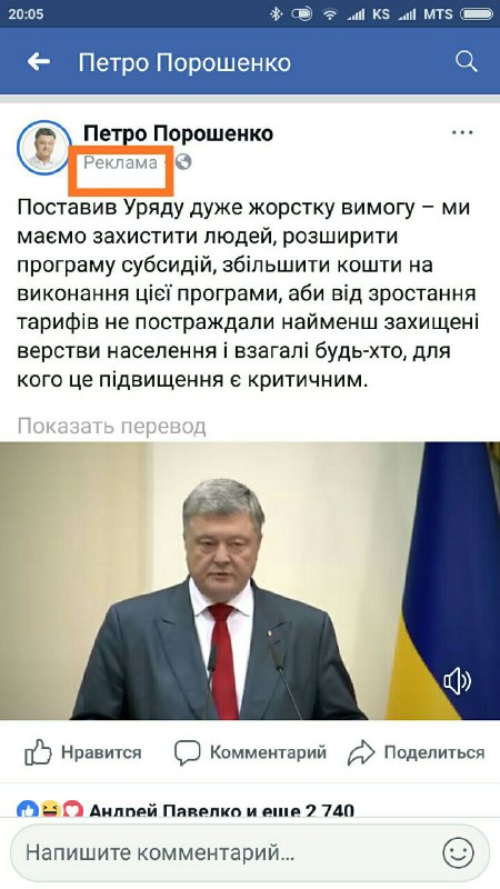 Пользователи Facebook обратили внимание и прислали в редакцию "Страны" скриншот страницы социальной сети с постом Петра Порошенко, который продвигается как реклама (за деньги Facebook показывает этот пост большему количеству людей, а не только тем, кто подписан на страницу президента и интересуется его деятельностью). Любопытно, что подвигается очень болезненная тема повышения цен на газ.