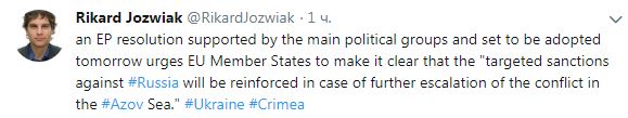 По информации журналиста, резолюция получила поддержку главных политических групп парламента, поэтому, скорее всего, документ завтра будет принят. "Резолюция призывает государства-члены ЕС четко заявить, что целенаправленные санкции против России будут усилены в случае дальнейшей эскалации конфликта в Азовском море", - сообщил журналист.