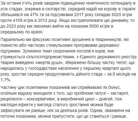 "Из Единого госреестра животных выведены "мертвые души", сохранена большая часть телят, родившихся в хозяйствах населения в первом квартале этого года, растет средняя продуктивность дойного стада – за 8 месяцев на 1,7%", - написал первый замминистра аграрной политики.