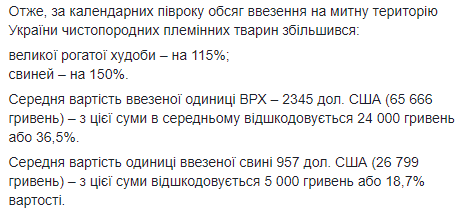 По его информации, за полгода благодаря госпрограмме возмещения стоимости высокопродуктивного поголовья увеличился ввоз в Украину чистопородного крупного рогатого скота на 115%, свиней – на 150%.
