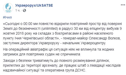 "Сегодня в 00:00 мы полностью открыли воздушное пространство от поверхности Земли до бесконечности (unlimited) в радиусе 30 км от эпицентра взрывов 9 октября 2018 года на складах с боеприпасами в районе населенного пункта Ичня Черниговской области", - цитирует пресс-служба заместителя директора "Украэроруха" генерал-майора Александра Волкова.