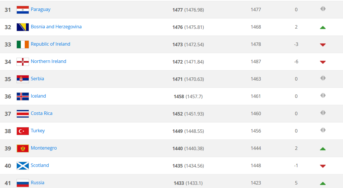 Сборная Украины, благодаря своим победам в Лиге Европы улучшила свой рейтинг и поднялась на две строчки вверх. Теперь наша команда занимает 27 позицию.