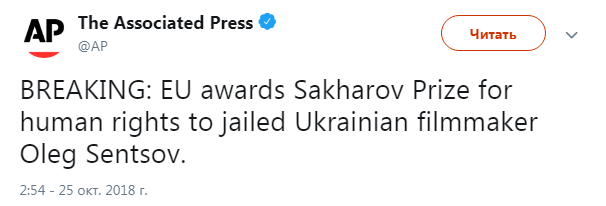 Украинский режиссер Олег Сенцов, который является политзаключенным и отбывает наказание в колонии в РФ по обвинению в терроризме, удостоен премии Сахарова. Об этом пишет АР в Twitter.