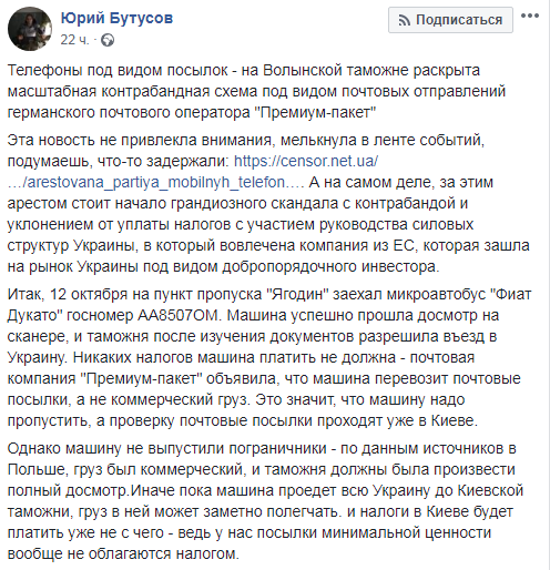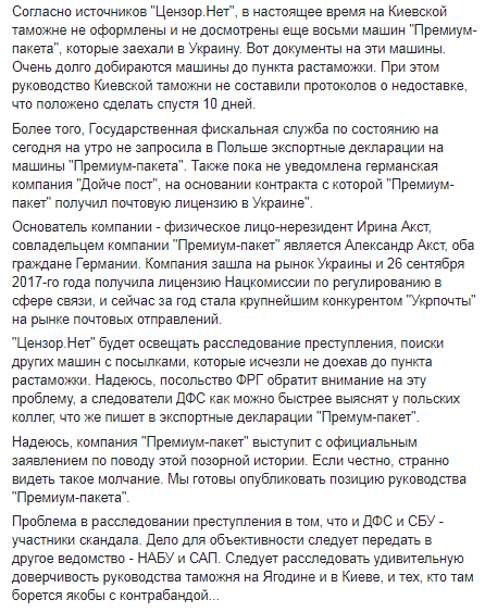 "Согласно источников "Цензор.Нет", в настоящее время на Киевской таможне не оформлены и не досмотрены еще восьми машин "Премиум-пакета", которые заехали в Украину. Вот документы на эти машины. Очень долго добираются машины до пункта растаможки. При этом руководство Киевской таможни не составили протоколов о недоставке, что положено сделать спустя 10 дней. Более того, Государственная фискальная служба по состоянию на сегодня на утро не запросила в Польше экспортные декларации на машины "Премиум-пакета". Также пока не уведомлена германская компания "Дойче пост", на основании контракта с которой "Премиум-пакет" получил почтовую лицензию в Украине", - отметил Юрий Бутусов.