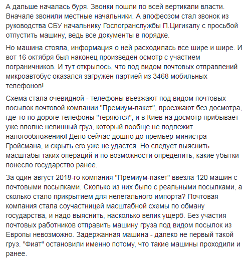 Он напомнил, что указанная компания была поймана на контрабанде 3,5 тысяч мобильных телефонов общей стоимостью $700 000. Микроавтобус "Фиат Дукато" с госномером АА8507ОМ, который перевозил телефоны, заехал на пункт пропуска "Ягодин". Почтовая компания "Премиум-пакет" объявила, что машина перевозит почтовые посылки, а значит, проверку она проходить должна в Киеве.