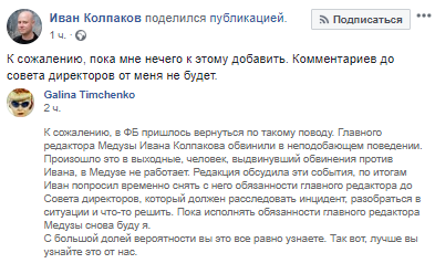 "Некоторое время назад случился неприятный инцидент. Ивана обвинили в неподобающем поведении. Иван Колпаков сам попросил меня на время снять с него обязанности главного редактора для того, чтобы совет директоров разобрался в ситуации и вынес взвешенное решение", - заявила она.