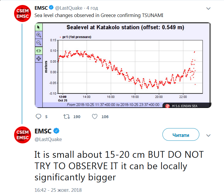 "Оно (цунами - Прим.Ред.) небольшое, 15-20 см. Но не пытайтесь посмотреть на него! Местами оно может быть значительно больше", - с юмором сообщили в Европейско-средиземноморско сейсмологическом центре.