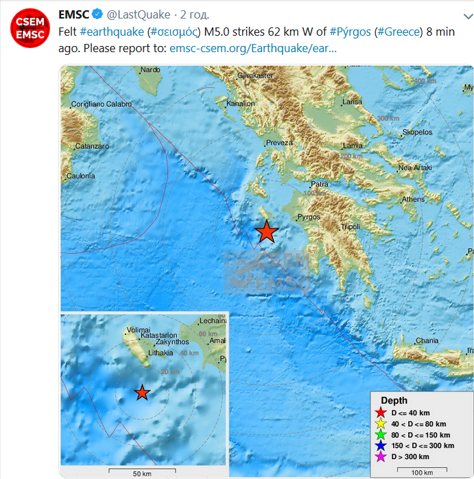 Как передает ТАСС со ссылкой на местные СМИ, без электричества остался остров Закинф, обрушилась часть древней башни на островке Строфадиа, находящемся к югу от Закинфа. Пожарная служба Греции роль, сообщает, что картина нанесенного ущерба пока неясна. Согласно первым данным, "с гор ссыпались камни на прибрежную дорогу, разрушен один дом в населенном пункте Лангадакиа, куда отправлен расчет пожарной команды".