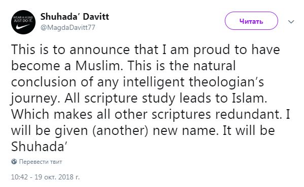 "Это естественный итог изысканий любого разумного теолога. Изучение священного писания ведет к исламу. Таким образом, все прочие священные тексты становятся излишни", - отметила она.