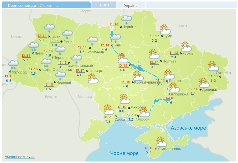По прогнозу синоптиков, ливни пройдут лишь на западе страны. Температура ночью +5-7, днем +​​14-16 тепла. В Карпатах ожидаются большие осадки.