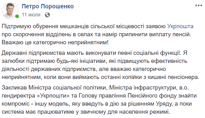 "Поддерживаю возмущение жителей сельской местности заявлением Укрпочты о сокращении отделений в селах и намерении прекратить выплату пенсий. Считаю это категорически неприемлемым!