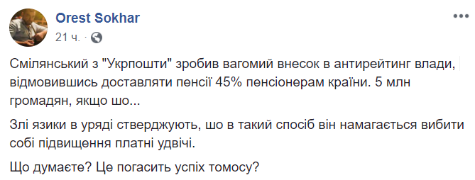 "Смелянский с "Укрпочты" сделал весомый вклад в антирейтинг власти, отказавшись доставлять пенсии 45% пенсионеров страны. 5 млн граждан, если шо ...