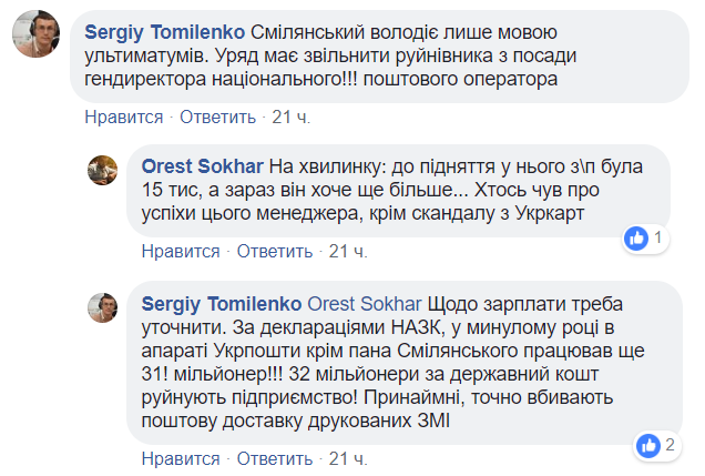 "Смелянский владеет только языком ультиматумов. Правительство должно уволить разрушителя с должности гендиректора национального почтового оператора", - пишет в Facebook глава Национального союза журналистов Сергей Томиленко.