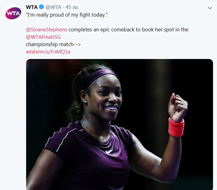 Сегодня, 27 октября, во втором полуфинале итогового турнира WTA в Сингапуре, американка Слоун Стивенс и чешская теннисистка Каролина Плишкова выясняли между собой, кто станет соперницей нашей Элины Свитолиной.
