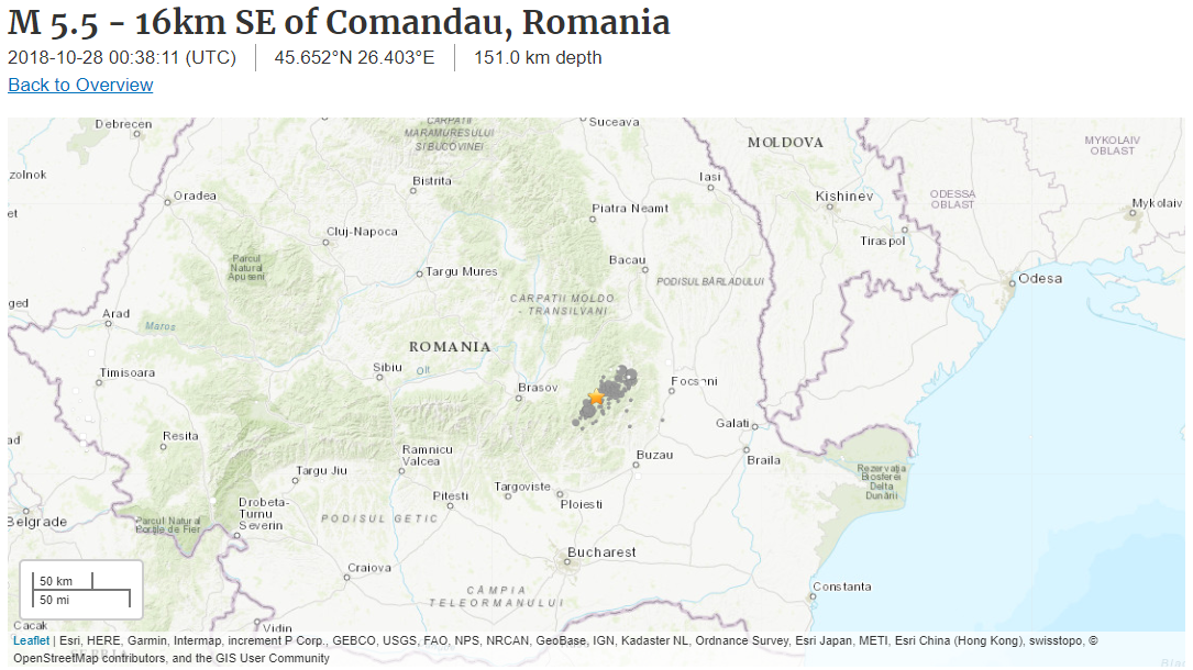 Ученые зафиксировали землетрясение силой 5,6 балла по шкале Рихтера. Толчки зафиксировали в 02:37 по местному времени. Эпицентр землетрясения находился на глубине более 148 километров в румынских горах Вранча - в 24 км к северо-западу от населенного пункта Ковасна с населением 11 тысяч человек.
