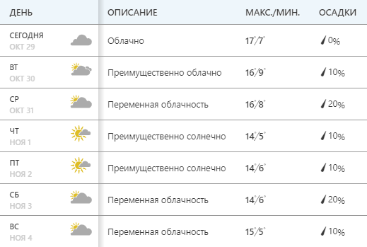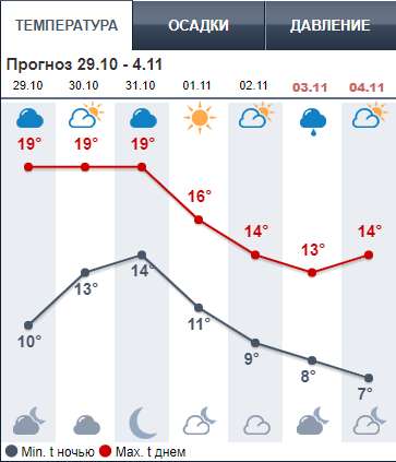 По данным сайта Sinoptik.ua, первые два дня недели будут пасмурными, в среду возможен дождь. Далее выглянет солнце. Температура +15...+16 до пятницы, а с 2 ноября +13. Ночью +6...+10.