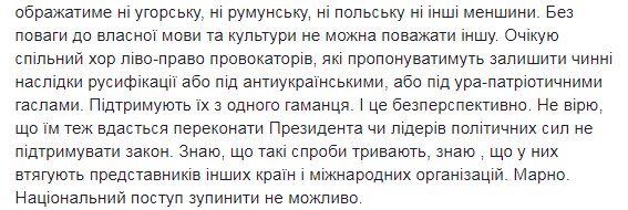 "И да, никто не будет запрещать англо-, франко-, немецко-, венгроязычные газеты. Как и не будет обижать ни венгерское, ни румынское, ни польское, ни другие меньшинства. Без уважения к собственной речи и культуры нельзя уважать другие", - отметил Княжицкий.
