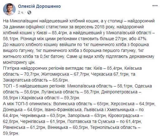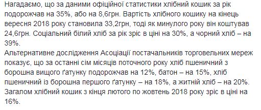 Стоимость хлебной корзины на конец сентября 2018 составляла 33,2 грн, тогда как в прошлом году она стоила 24,6 грн. Социальный белый хлеб за год вырос в цене на 30%, а ржаной хлеб - на 39%.