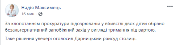 По ходатайству прокуратуры подозреваемой в убийстве двух детей избрана безальтернативная мера пресечения в виде содержания под стражей. Об этом сообщила пресс-секретарь киевской прокуратуры Надежда Максимец в Facebook. Решение о мере пресечения принимал Дарницкий райсуд столицы.
