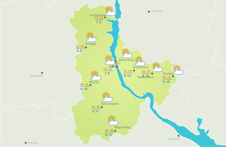 Ночью и утром в столице местами туман. Ветер юго-восточный, 5-10 м/с. Что касается Киевской области, теплее всего сегодня будет в Ирпене и Кагарлыге. Здесь температура ночью ожидается +10…+11, днем +15…+16. На протяжении всего дня будет стоять облачная погода. Без осадков.