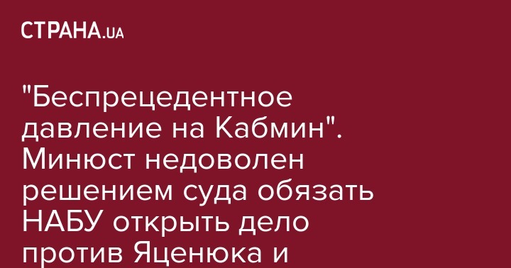Министерство юстиции считает беспрецедентным давлением на Кабинет Министров решение суда обязать Национальное антикоррупционное бюро (НАБУ) открыть уголовное производство против бывшего премьер-министра Арсения Яценюка и министра юстиции Павла Петренко.