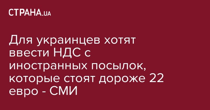 Министерство Финансов Украины, Государственная фискальная служба предлагают ввести НДС на международные посылки, которые ввозятся в Украину, если их стоимость превышает 22 евро. Об этом сообщил источник, пожелавший остаться неизвестным, сообщает galinfo.
