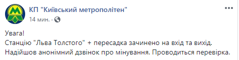"Станция "Льва Толстого" + пересадка закрыта на вход и выход. Поступил анонимный звонок о минировании. Проводится проверка", - говорится в сообщении КП "Киевский метрополитен" на странице в Facebook во вторник вечером.