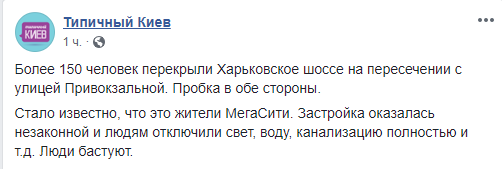"Более 150 человек перекрыли Харьковское шоссе на пересечении с улицей Привокзальной. Пробка в обе стороны. Стало известно, что это жители МегаСити. Застройка оказалась незаконной и людям отключили свет, воду, канализацию полностью и т.д. Люди бастуют", - говорится в сообщении.