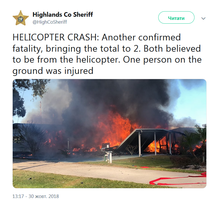 Во вторник, 30 октября, в США произошла очередная авиакатастрофа с частным вертолетом. Трагедия случилась в штате Флорида, где воздушная машина рухнула на автомобильную стоянку для трейлеров. Об этом сообщили в офисе местного шерифа.