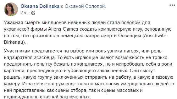 "Игра является руководством по массовому умерщвлению людей: в ней представлены как сцены отбора, так и сцены массовых и индивидуальных казней заключенных", - говорится на Facebook-странице Оксаны Долинской.