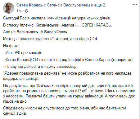 Правительство России, скорее всего, допустила ошибку, накладывая санкции против украинских лиц и компаний. Вместо лидера "С14" Евгения Васильевича Карася в санкционный список был внесен Евгений Валерьевич Карась - известный украинский галерист. Об этом на своей странице в Facebook сообщил руководитель организации "С14".