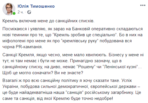 Лидер "Батькивщины" отметила, что российские санкции ее мало волнуют, поскольку у нее нет бизнеса ни в Украине, ни в РФ. Также Тимошенко отметила, что ее удивляет, что в санкционном списке нет "Рошена" или "Ленинской кузницы". По ее мнению, адекватным ответом на санкционную политику РФ будет создание сильного демократического государства.