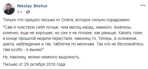 Щур отметил, что получил от Сенцова письмо, датированное 29 октября. В нем он указал, что чувствуется себя намного лучше и анализы уже не такие плохие, как раньше. "Капать тоже в конце прошлой недели перестали, наконец-то. Теперь в основном диета, наблюдения и так, таблетки, по мелочам. Так что не беспокойтесь там особо - я выжил", - процитировал правозащитник фрагмент текста.