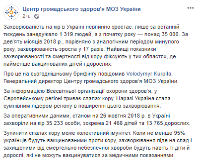 "Заболеваемость корью в Украине постоянно растет: только за последнюю неделю заболело 1319 человек, а с начала года - более 35 000. За девять месяцев 2018 по сравнению с аналогичным периодом прошлого года, заболеваемость выросла в 17 раз", - говорится в нем.