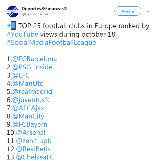 Лидером видеорейтинга стала "Барселона" с результатом 20,9 млн. просмотров. На втором месте парижский "ПСЖ" - 8,3 млн. Замыкает тройку лидеров среди Youtube-каналов "Ливерпуль". Англичан насмотрели на 6,8 млн просмотров.
