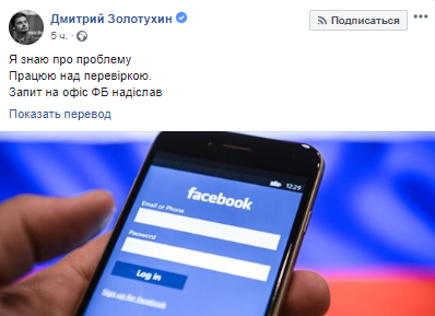 "Я знаю о проблеме. Работаю над проверкой. Запрос на офис ФБ отправил", - отметил замминистра.