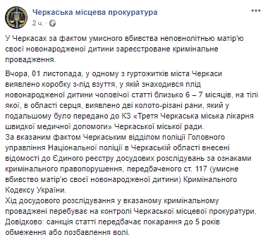 Как заявили в ведомстве, по данному факту правоохранители начали уголовное производство по статье умышленное убийство матерью своего новорожденного ребенка. Санкция статьи предусматривает наказание до пяти лет ограничения или лишения свободы.