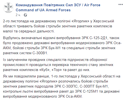 Программа госиспытаний модернизированного ЗРК "ОСА-АКМ" стартовала в ходе прошедших 1 ноября на полигоне "Ягорлык" в Херсонской области боевых стрельб зенитных ракетных подразделений ЗРК С-300ПС, С-300ПТ Бук-М1.
