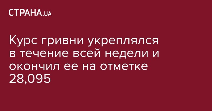 Курс гривни на межбанковском валютном рынке в пятницу укрепился до 28,095 грн/$1 с 28,1125 грн/$1 днем ранее, сообщили агентству Интерфакс-Украина дилеры коммерческих банков. Падение курса доллара началось еще в прошлую пятницу.