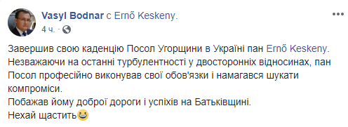 "Завершил свою каденцию посол Венгрии в Украине господин Эрно Кешкень. Несмотря на последние турбулентности в двусторонних отношениях, господин посол профессионально выполнял свои обязанности и пытался искать компромиссы. Пожелал ему хорошей дороги и успехов на родине", - написал Боднар.