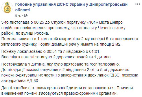 Сегодня, 3 ноября, в Днепре во время пожара в пятиэтажном доме погибли 3 человека. Об этом сообщает пресс-служба ГосЧС Украины в Днепропетровской области.