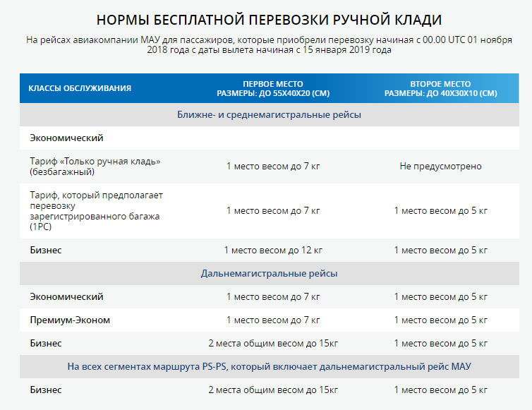 МАУ меняет правила перевоза ручной клади с 15 января 2019 года. Пассажиры, которые приобрели билеты, в стоимость которых не входит перевозка зарегистрированного багажа, смогут взять с собой на борт самолета одно место ручной клади весом до 7 кг и размерами не более чем 55х40х20 см, а также верхнюю одежду и зонтик. Пассажиры, перевозящие зарегистрированный багаж и пассажиры эконом-премиум класса на дальнемагистральных рейсах смогут взять с собой на борт самолета два места ручной клади: одно место весом до 7 кг и размерами не более 55х40х20 см и одно место весом до 5 кг и размерами не более 40х30х10 см (для размещения под сидением кресла впереди), а также верхнюю одежду и зонтик.