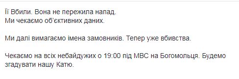 "Ее Убили. Она не пережила нападение. Мы ждем объективных данных. Мы требуем имена заказчиков. Теперь уже убийства. Ждем всех неравнодушных в 19:00 под МВД на Богомольца. Будем вспоминать нашу Катю", - говорится в сообщении сообщества в Facebook.